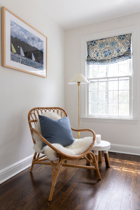 This more than 50-year-old farmhouse is a hidden gem in the backcountry of Greenwich. Our client fell in love with the original wood floors and tiled kitchen, large cozy fireplace, and the idyllic pond in the backyard. Over a couple of years, we transformed this home into a serene retreat for our client by layering in beautiful textiles, art, and hand-painted walls.